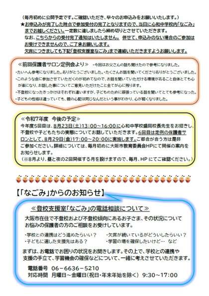 【大阪市内の保護者のみなさま】登校支援室なごみ主催 親子 DE サロン 公開日 2025/07/16 更新日 2025/07/16 お知らせ 不登校に関する不安や悩みをお持ちの保護者の方とお子さまを対象に、登校支援室なごみが7月26日(土)15時からイベントを行います。 カードゲームやボードゲームを親子で楽しんでみませんか。 詳細・申込については下記リンクをご参照ください。(申込は先着順) 親子 DE サロン いいね(0)