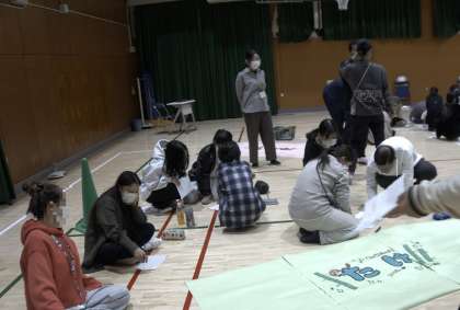 その前に、いろいろな言語で、みんなの名前を書いたカードを大きな紙に貼って、各チームごとに大きな応援ポスターを作りました。