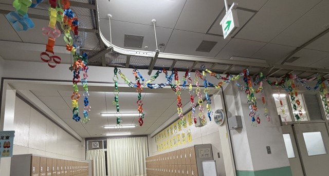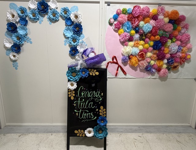 校内の卒業生へのはなむけとして、卒業式に向けて職員室前の飾り付けをしています。