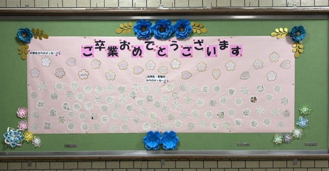 玄関の掲示板には、心和中学校の在校生、教職員、登校支援室「なごみ」の職員から、卒業生のみなさんへメッセージを掲示しています。
