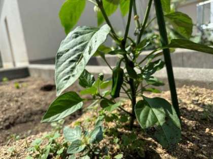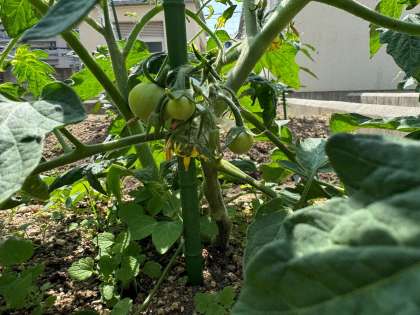 なす、ピーマン、ミニトマトに小さな実りが見られます。