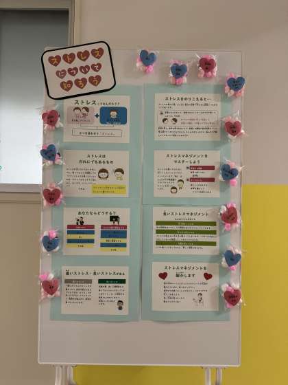掲示の周りのハートにはストレスを軽くするための方法が書かれています。