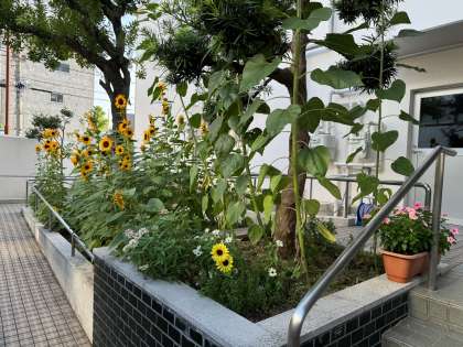 玄関のスロープ付近にひまわりがきれいに咲いています。