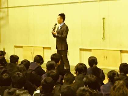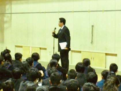 話の最初に、校長先生から「校訓」を知っていますか?と3年生に質問がありました。さすが3年生、見事答えました。