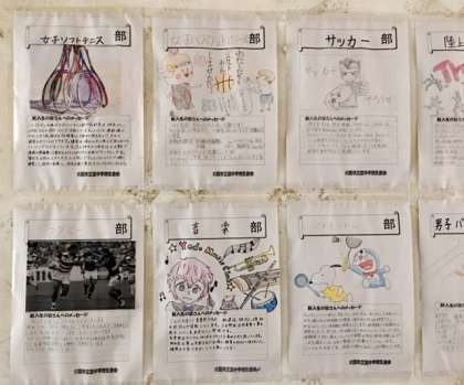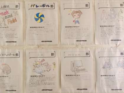 1年校舎の廊下に、部活動勧誘のポスターが貼られています。