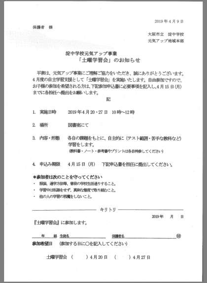 全校集会の最後に中森先生から、土曜学習会へ参加のお知らせがありました。