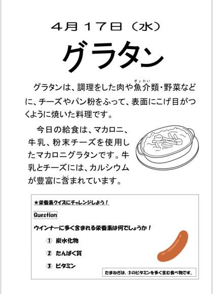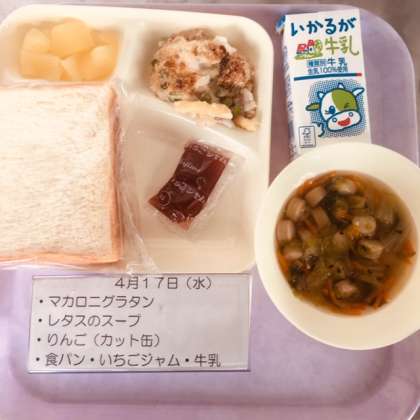 本日の献立、マカロニグラタン、レタスのスープ、リンゴ(缶詰)、食パン、いちごジャム、牛乳です。