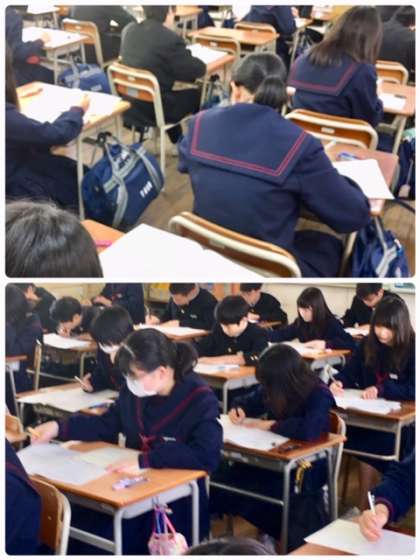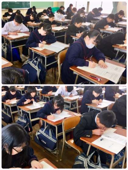 本日1時間目より、全国学力・学習状況調査(全国学テ)が始まりますました。3年生の生徒は、一心に問題に取り組んでいます。どの生徒の表情も真剣で立派です。
