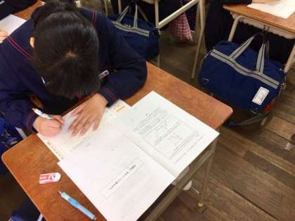 1時間目は国語でした。国語科担当の先生にうかがうと、ふりかえりプリントや1年生からの平素の授業で取り組んだ既習事項が出題されています。本校の課題である無回答率も少ないと教えてくださいました。