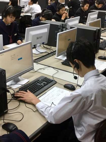 読む、書く、聴くのテストは教室で行われましたが、話すはパソコン室で一人一人ベッドセットを付けてテストしました。