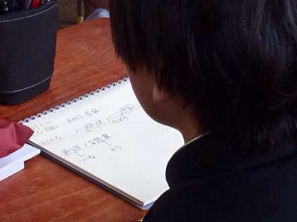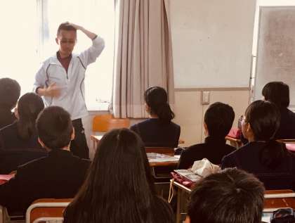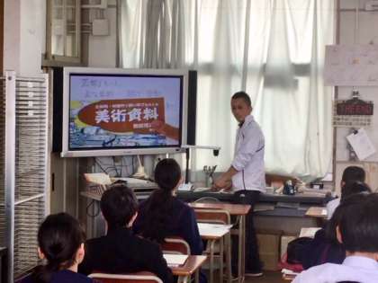 美術の授業です。ICT機器を有効に活用してとても生徒にわかりやすく指導されています。先生はユーモアたっぷりに身振り手振りで授業してくださっています。生徒たちはリラックスした中で、妙にくだけることなく、しっかり集中して授業を受けていました。