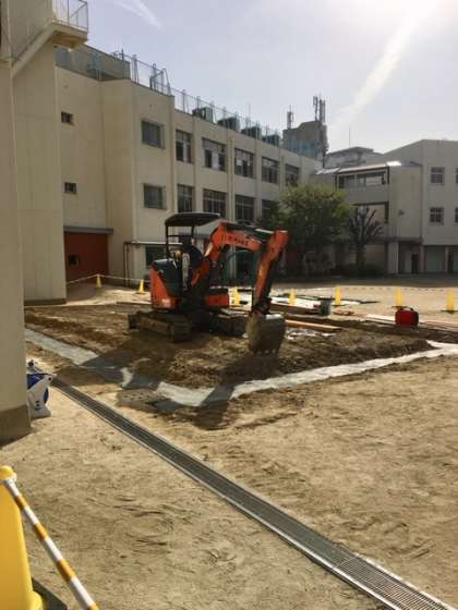 1年生校舎の前に工事事務所が進みました。重機が入り基礎のコンクリートが流し込まれました。