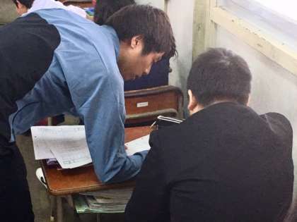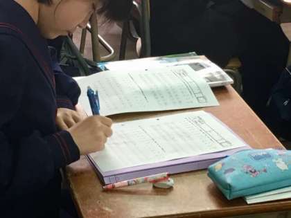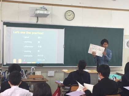 1年生の英語の授業です。アルファベットを学んでいました。生徒に「アルファベットは難しいですか?」と尋ねると、「小学校で学習してので大丈夫です。」と答えてくれました。