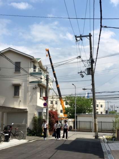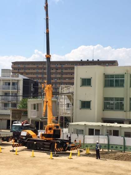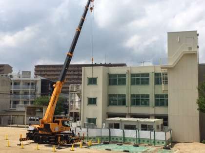 昼前に運動場に大きなクレーン車が入って来ました。今週の初めから工事をしていた、工事事務所の設置です。大きなトラックで運ばれてきたプレハブユニットがクレーン車に釣り上げられ、基礎部分に設置されていきます。ユニットが連携され一階部分が形を表しました。