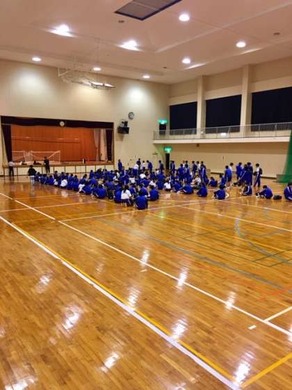 全体レクリエーションが始まります。筒城浜の体育館に各宿舎から集まりました。立派な広い体育館です。