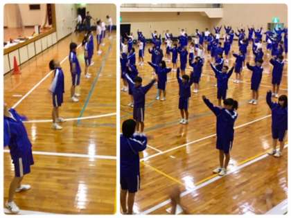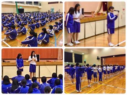 かかり生徒の司会で開会式が行われました。体育委員の指揮でラジオ体操をしました。