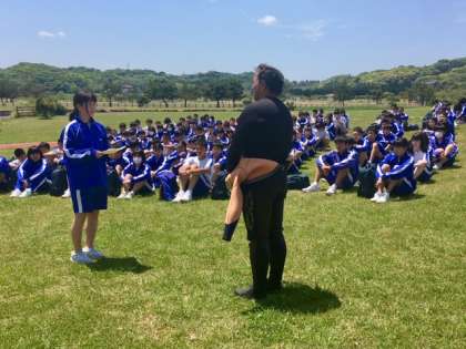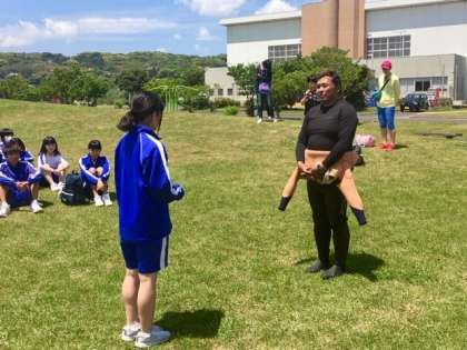昼食を終えて、午後のプログラムです。午後はマリンスポーツ体験です。インストラクターの方に諸注意とウエットスーツの着方を習いました。