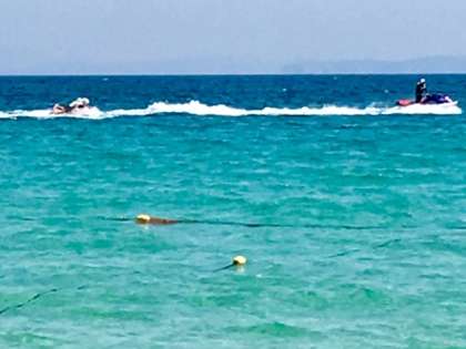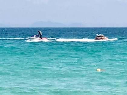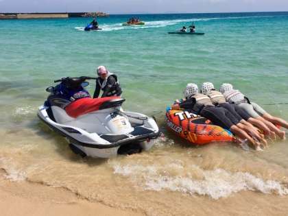 ビスケットボートです。丸いフロートにヘッドギアを付けてつかまります。そのフロートをジェットスキーで引っ張って海原を滑走します。