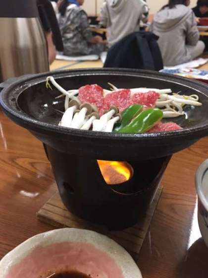 2日目の夕食です。今夜のメイン料理は壱岐牛の鉄板焼きです。1組では魚釣りに行った生徒がたくさん魚を釣ってきたので、宿舎の方が料理してくださいました。
