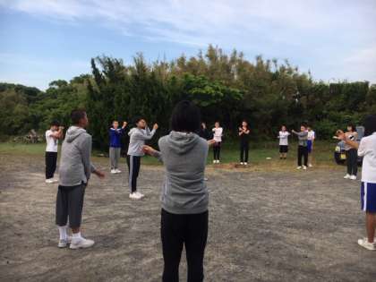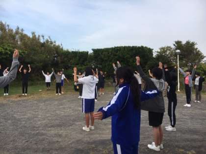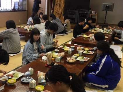 4組の朝の集いと朝食の様子です。昨夜は比較的みんなよく眠っていました。少し疲れが残っていますが、朝食はおいしくいただきました。