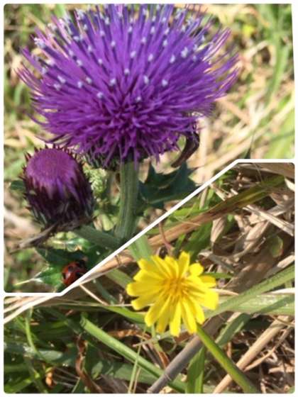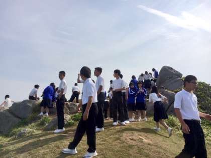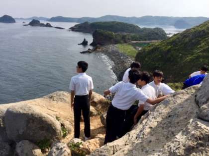 3組、4組は猿岩に到着しました。巨大なお猿さんにびっくり。足もとには朝露にぬれた草花、崖下には紺碧の海が広がっています。