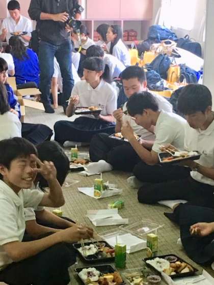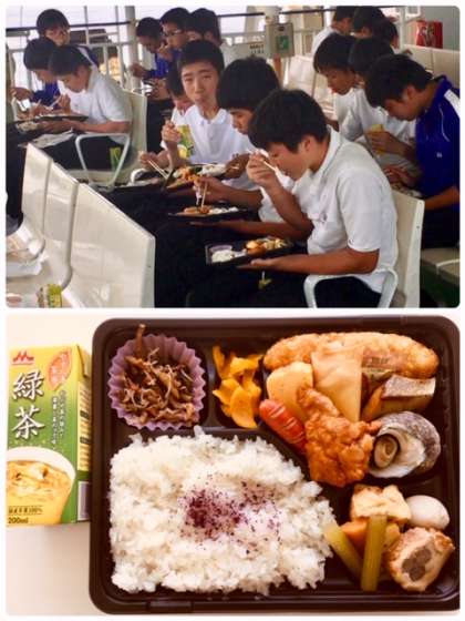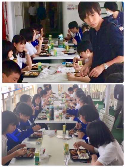 昼食の時間です。フェリーボートの中でみんなでお弁当を食べます。壱岐の島のお弁当らしく、お弁当にサザエのつぼ焼きも入っています。