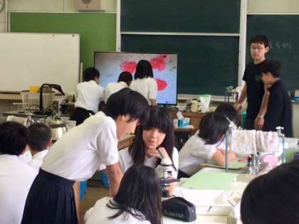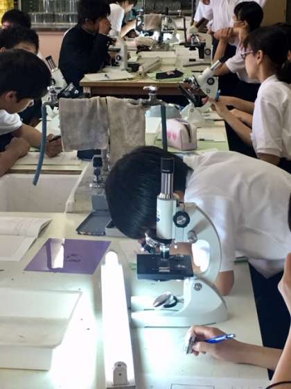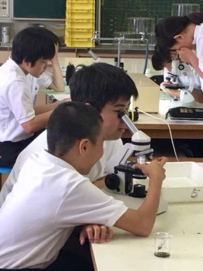 1年理科の授業です。顕微鏡を使ってミクロの世界を観察しています。ミカヅキモやミジンコが見られます。