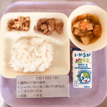 本日の献立は、鶏肉の照り焼き、ジャガイモと厚あげの煮物、ごまかか炒め、米飯、牛乳です。