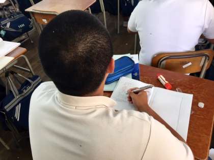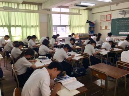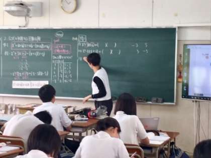 大型ディスプレイと黒板を使って江田先生が先生が説明してくださっています。生徒も真剣な眼差しで問題に取り組んでいます。
