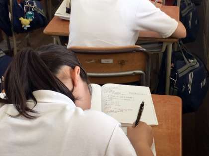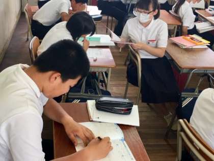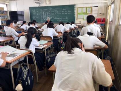 3年理科の授業です。植物の単元です。コツコツと課題に取り組む生徒、友だちと相談して問題をこなす生徒、どのクラスも1週間前に迫ったテストに向けて頑張っています。