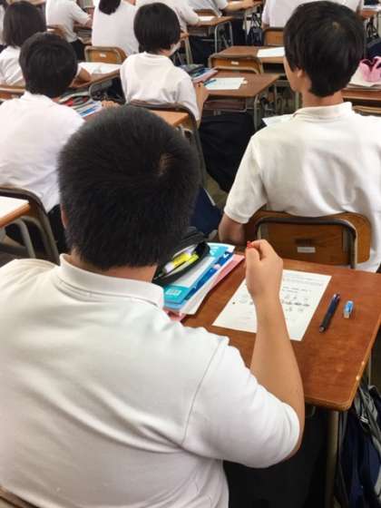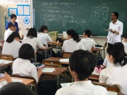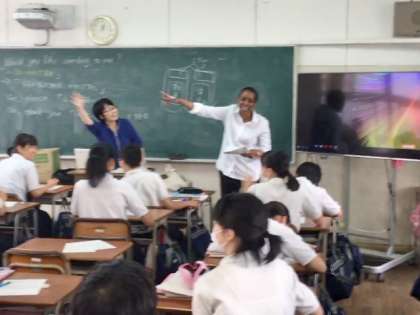 3年4組英語の授業です。今日はC-netのテニーシャ先生も一緒に学習しています。生徒も積極的に英語で答えていました。