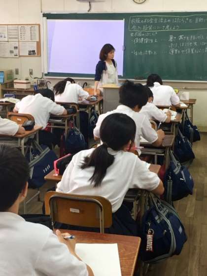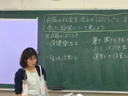 1年2組家庭科の授業です。「衣服の社会生活上の働き」について学習しています。