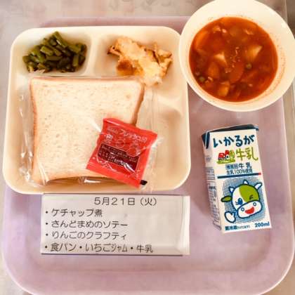 本日の献立は、ケチャップ煮、三度豆のソテー、リンゴのグラフティ、食パン、いちごジャム、牛乳です。