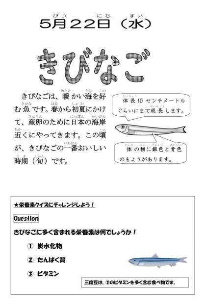 本日の献立は、キビナゴ天ぷら、豚汁、若竹煮、米飯、牛乳、やわらか丹波黒(黒大豆)です。