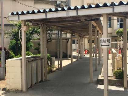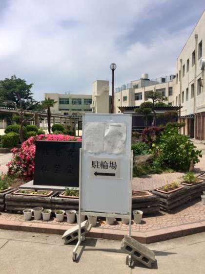 校舎建て替え工事中のため、自転車でお越しの保護者の方は第五校舎裏の駐輪場のご利用をお願いします。駐輪台数に限りがあります。奥から詰めて譲り合って駐輪してください。