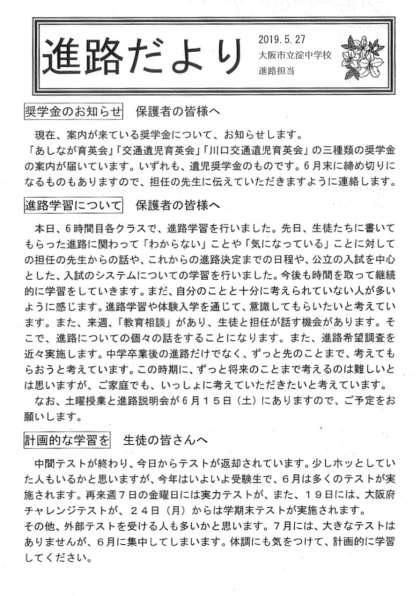 3年生の生徒を通じて「進路だより」を配付しました。本日、6時間目の参観授業に関連しています。是非ご確認ください。