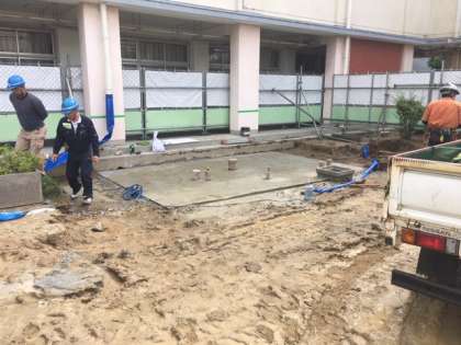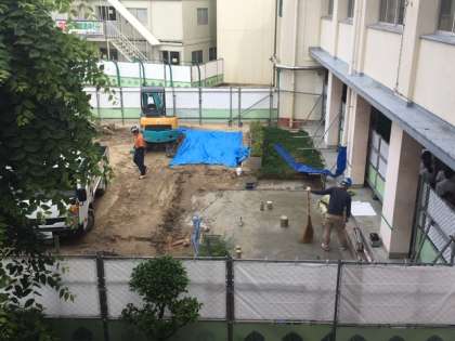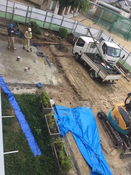 多目的室前に新しく建設される給茶室です。先週の土曜日に植栽を取り除き、月曜日から着工しました。今朝には基礎部分のコンクリートが固まって次の工程に進んでいます。