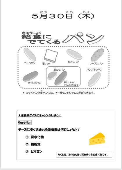 今日はパン食です。あるクラスで生徒に「パンとごはんどちらが好きですか?」と聞きました。すると、私の予想を反して、圧倒的にパン食が好き!と答える生徒が多くいました。(ひょっとして、そのクラスだけがパン好きの生徒が多かったかも知れませんね。)