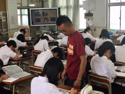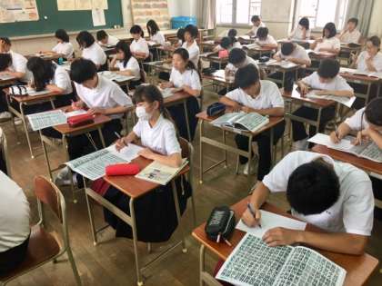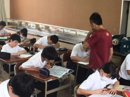 1年2組の美術の授業です。レタリングを学習しています。増田先生のアドバイスを受け、どの生徒も真剣に取り組んでいます。