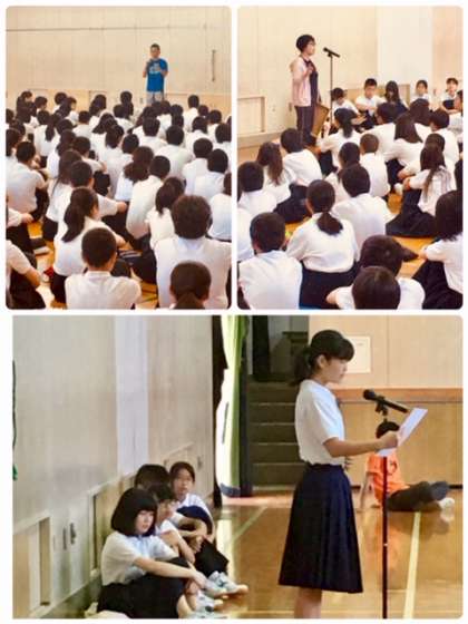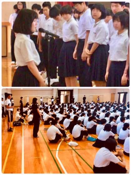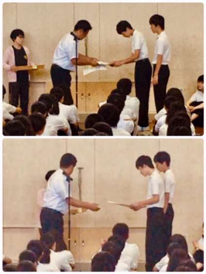 賞状伝達では、春季総体でバドミントン部の3年生奥野さんと福田さんが男子ダブルス三位となり表彰状と銅メダルが授与されました。春季総体では他に、陸上部、卓球部男女、体操競技が出場していました。