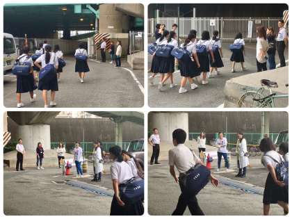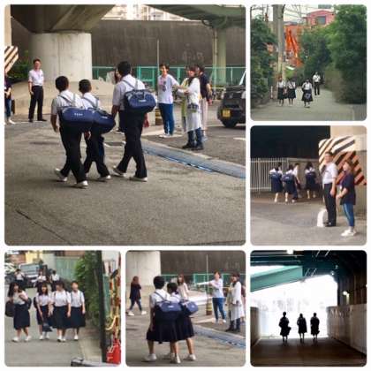 PTA見守りデーです。川北地区の登校の様子です。保護者の方々に話を伺うと以前は南側の長いスロープを通って中学校に登校する生徒が多かったそうです。今年は国道43号線の下をくぐって出来島駅の方向へ向かう生徒が多いとのこと。出来島小学校西側の国道43号線横断歩道を渡るより安全ですと教えてくださいました。