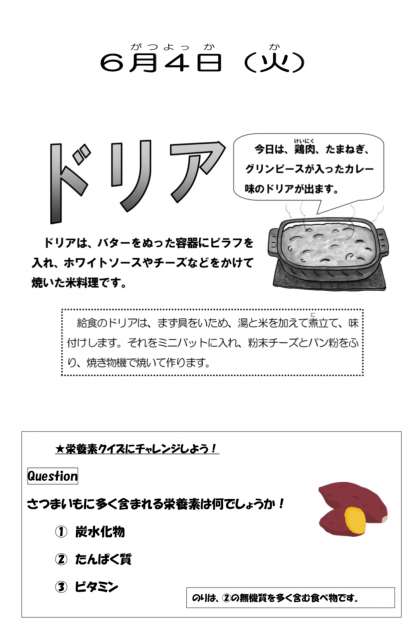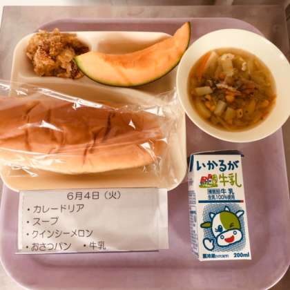 今日の献立は、カレードリア、スープ、クインシーメロン、おさつパン、牛乳です。