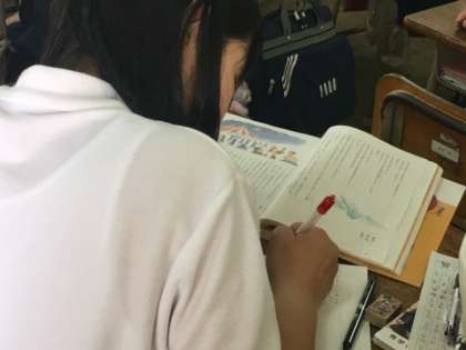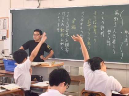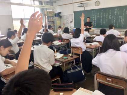 1年2組の国語の授業です。学年主任の安江先生の授業では、生徒たちはこぞって手を上げます。活性した授業です。