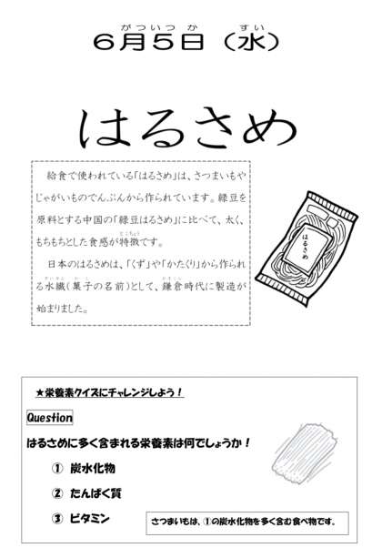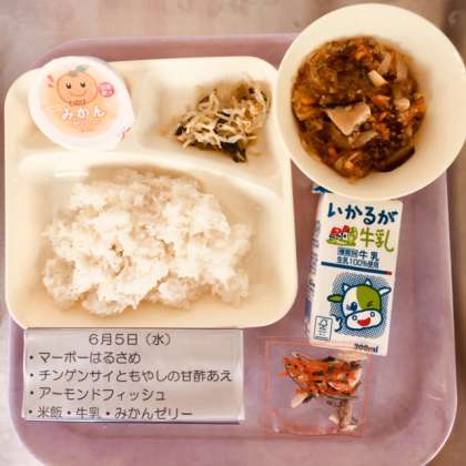 今日の献立は、麻婆春雨、青梗菜とモヤシの甘酢和え、米飯、アーモンドフィッシュ、みかんゼリー、牛乳です。