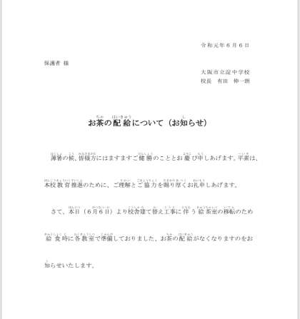 本日、昼食時のお茶の配給について(お知らせ)のプリントを配付いたしました。確認ください。プリントをご確認ください。