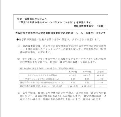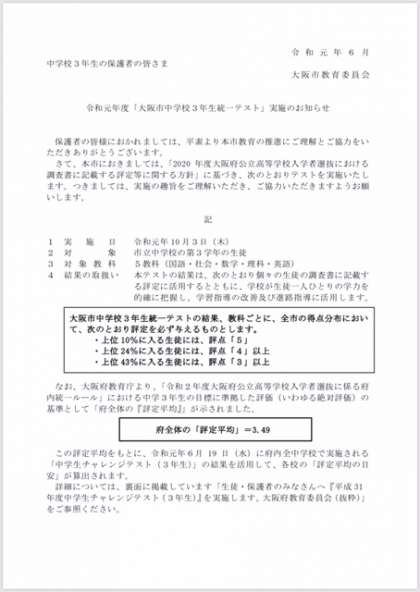 「大阪市中学校3年生統一テスト」実施のお知らせ