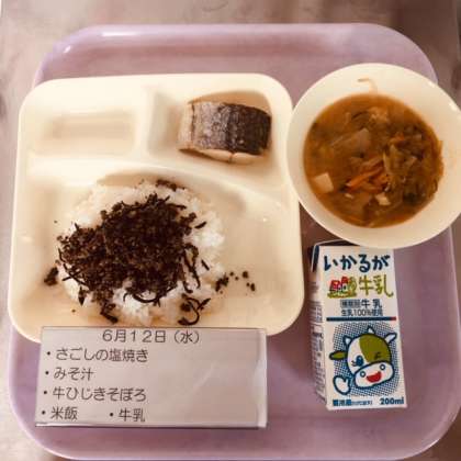 本日の献立は、さごしの塩焼、牛ひじきそぼろ、味噌汁、米飯、牛乳です。