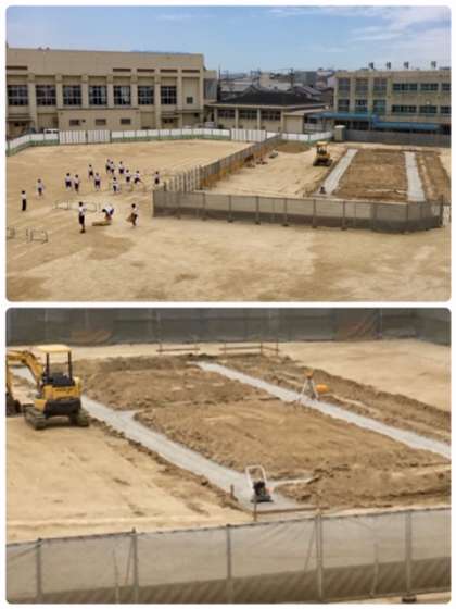 仮設プレハブ校舎の土台部分のコンクリート埋設が進んできました。
