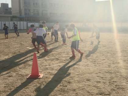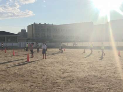 西日が眩しいグラウンドでサッカー部が夢中になってボールを操っています。上手いものです。