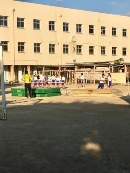 工事で狭くなった運動場で、陸上部の生徒がハイジャンプ(走り高跳び)の練習をしています。